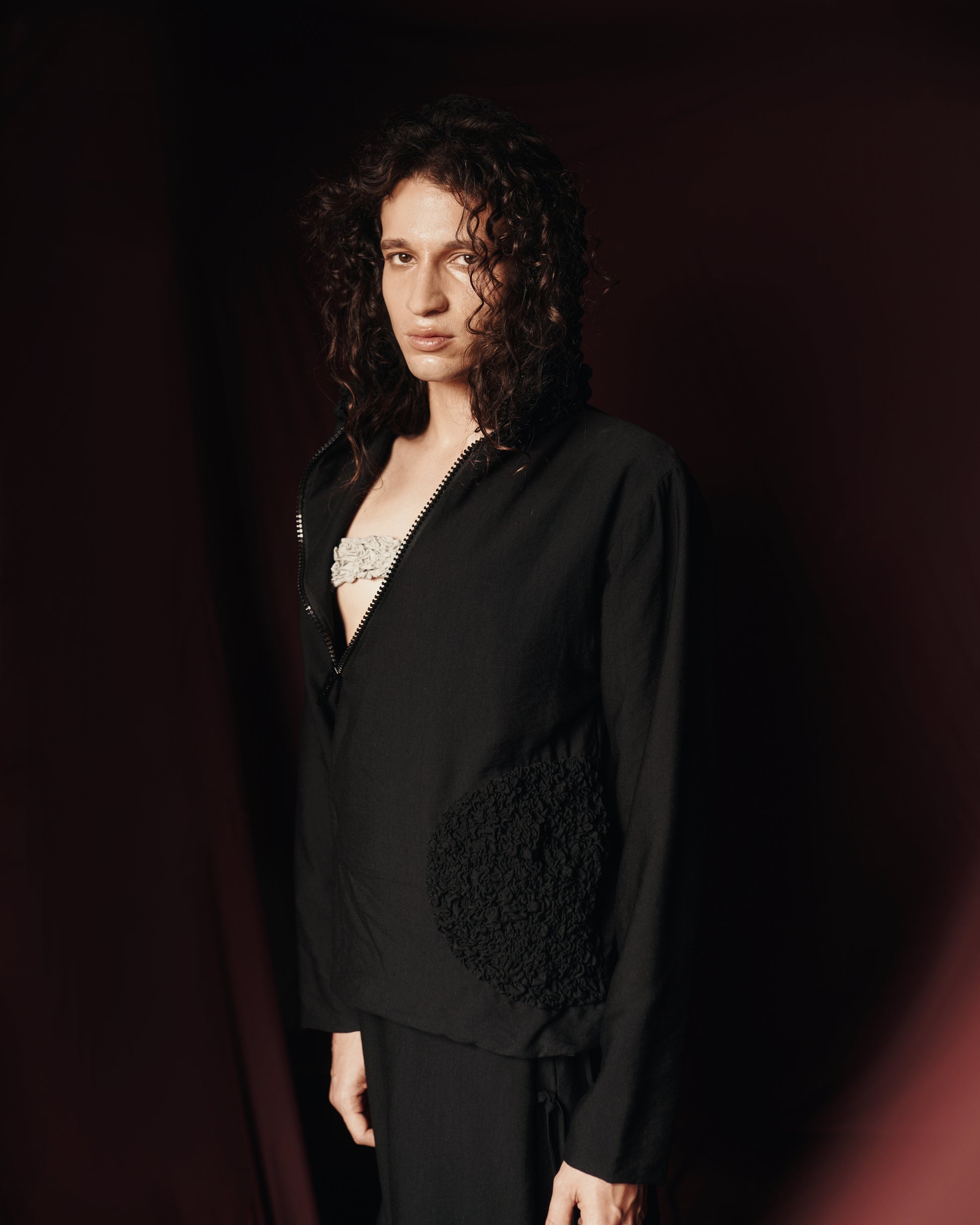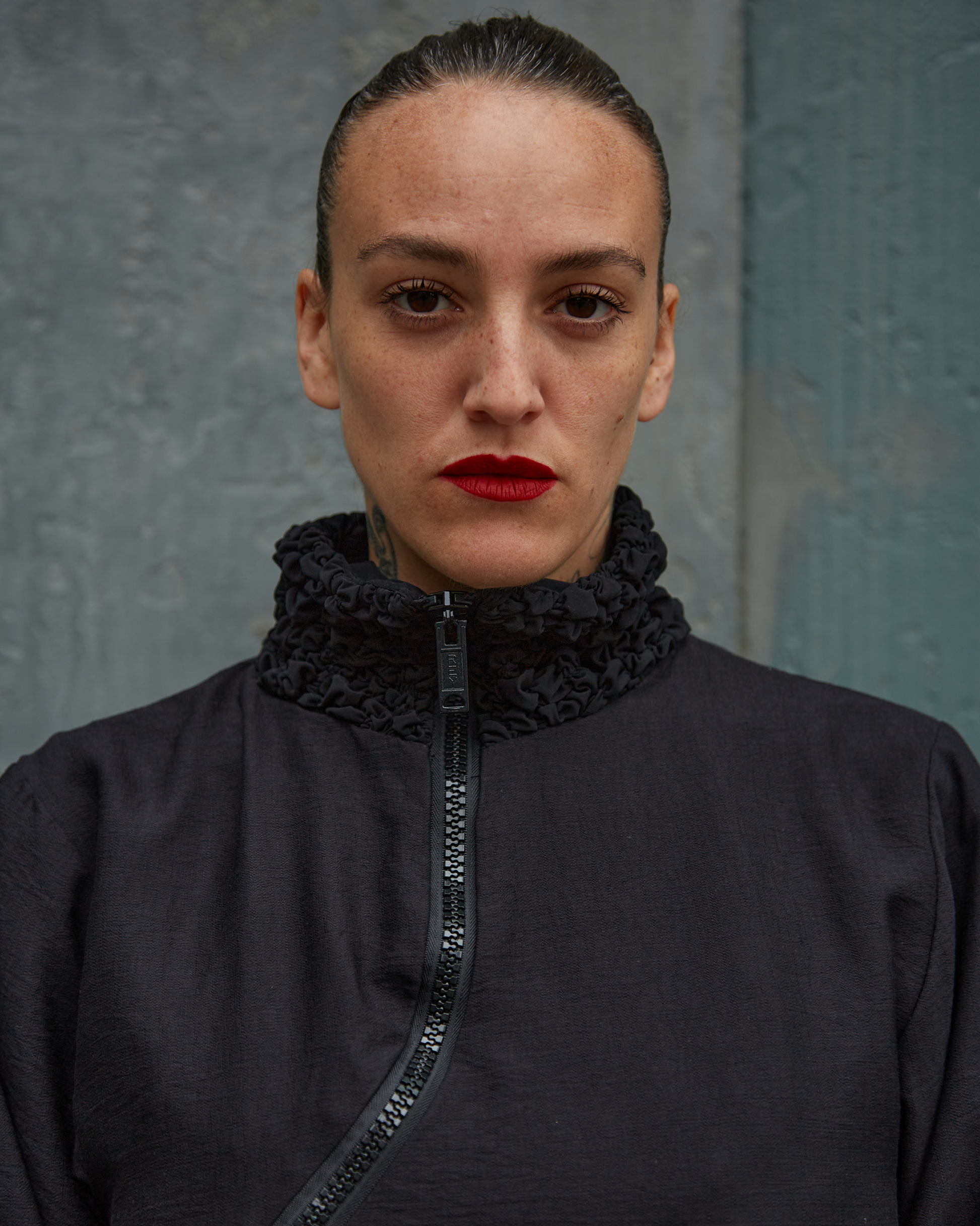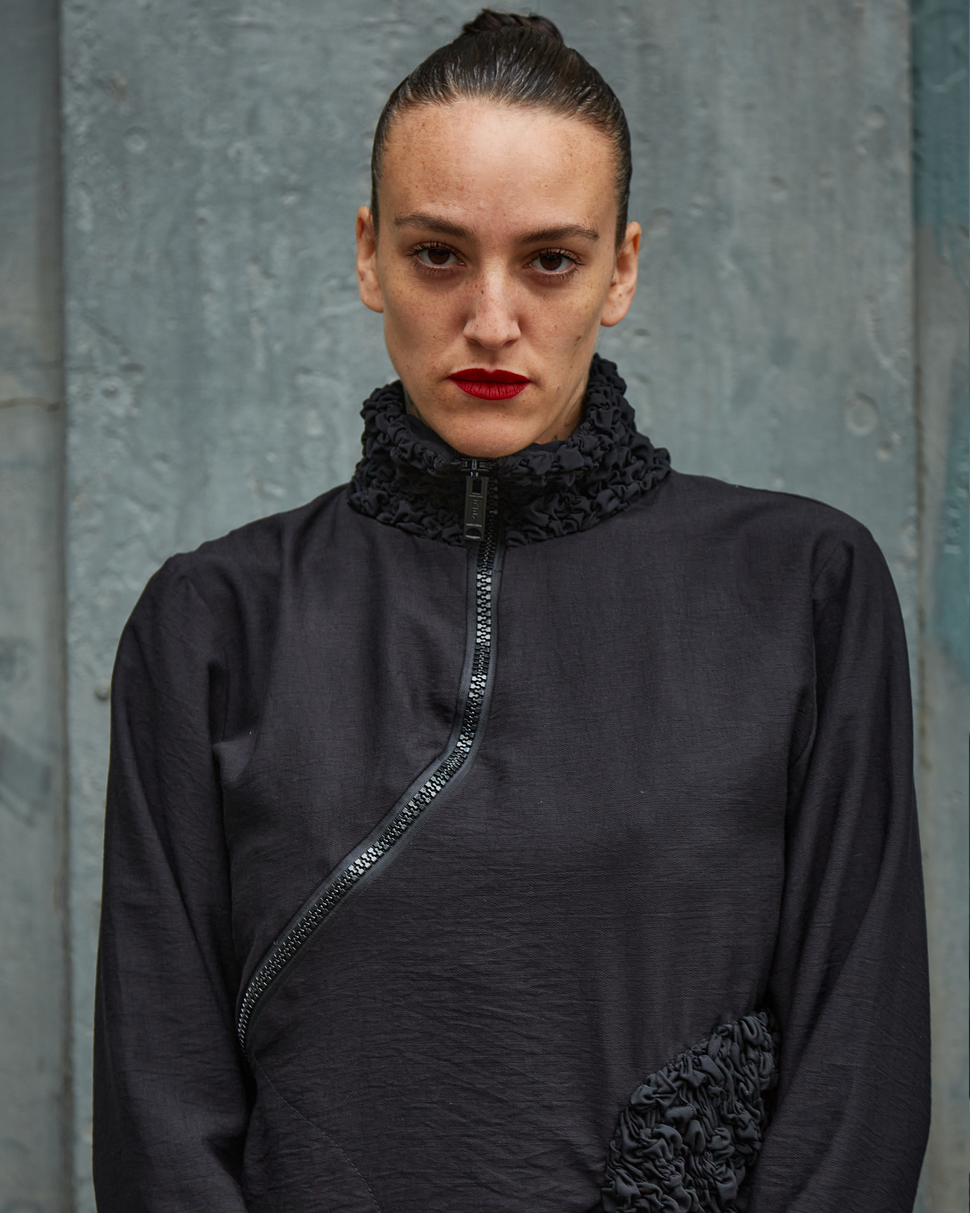 Cuello y bolsillo fruncidos en licra, acompañados de una maxi cremallera en plástico confeccionada en curva, retando los limites y usos de una cremallera. En las mangas se encuentran dos tiras para ajustar la muñeca a tu gusto.