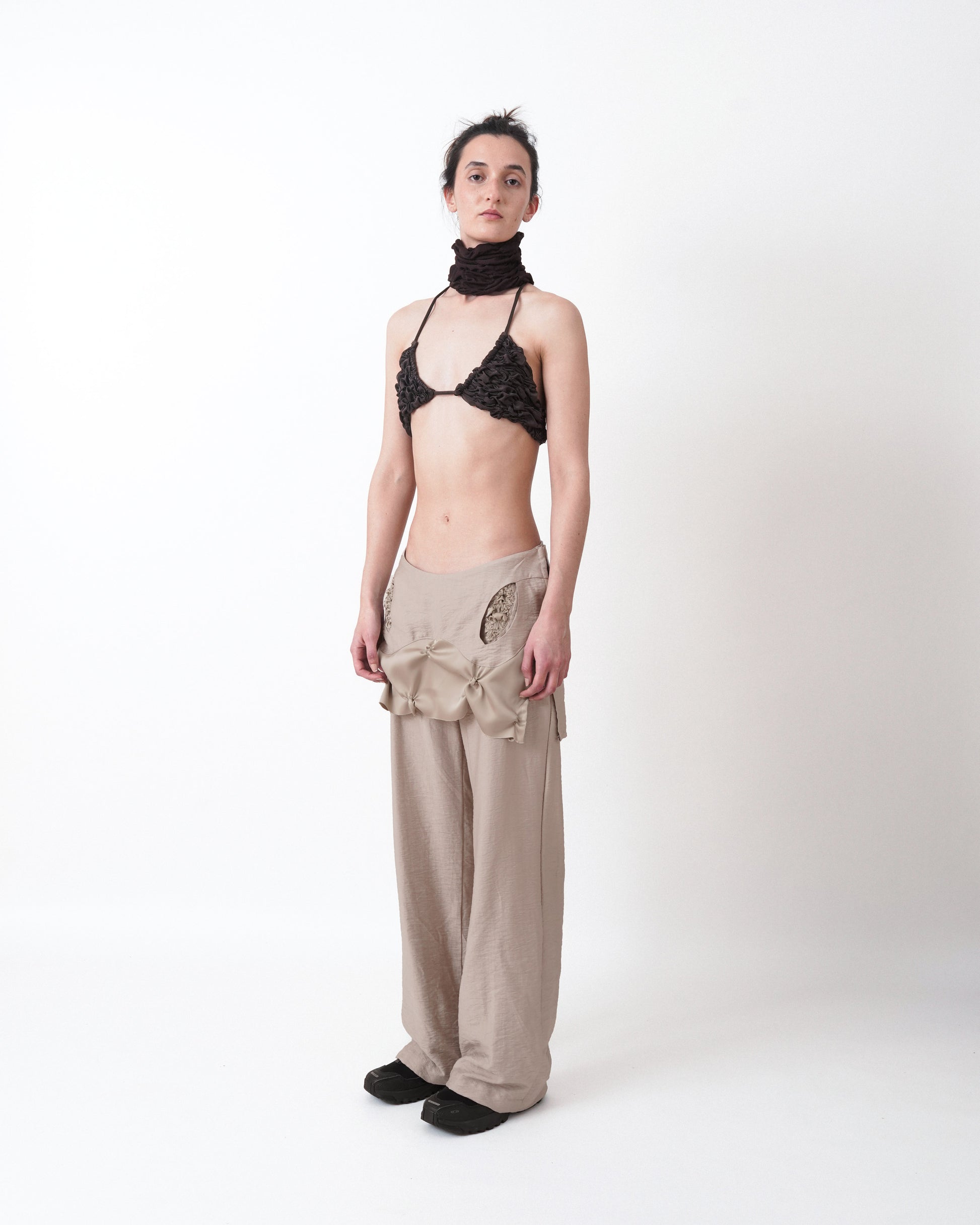 Este pantalón hecho en 100% rayón con acabado crepé, viene también acompañado de una falda que puedes quitar y poner a tu gusto pues viene con unos broches metálicos en el costado izquierdo. La falda ahuecada revela unos ovalos fruncidos que vienen siendo parte del diseño del pantalón.