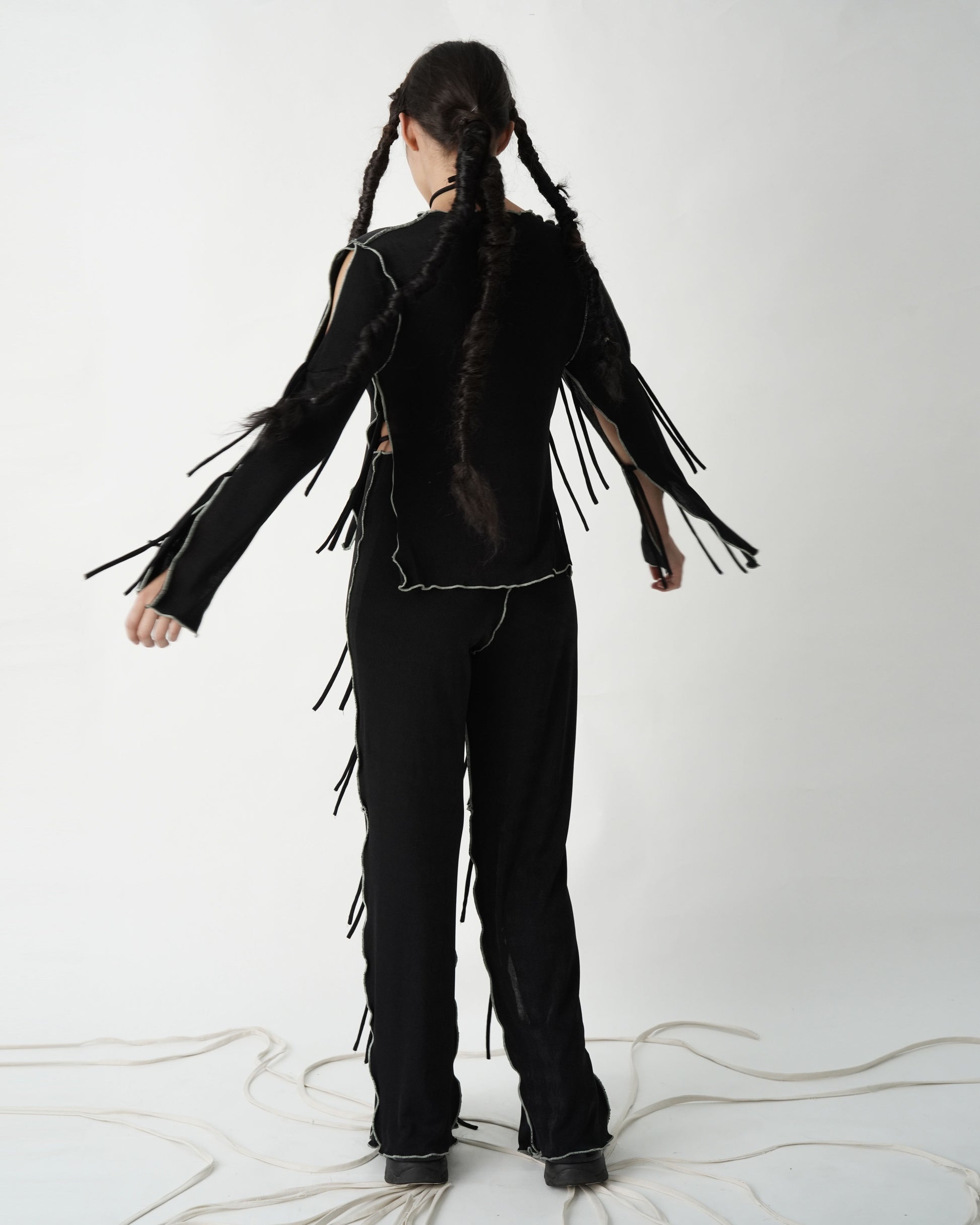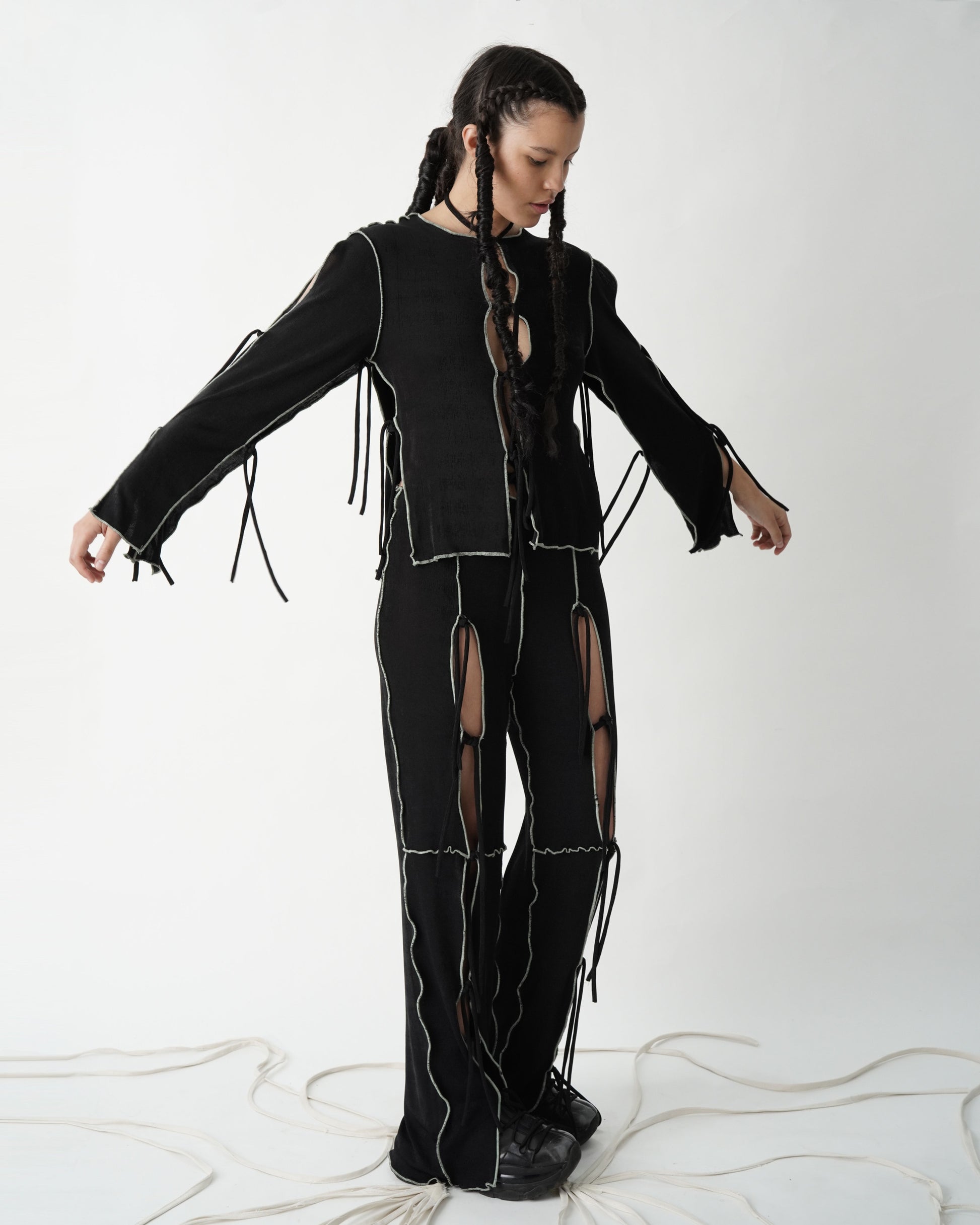 Pieza ligera y fluida ensamblada a partir de nudos en brazos y delantero que resulta con una caída única y un corte que revela la piel. Este top está hecho en un rib strech 100% poliéster con acabado satinado.