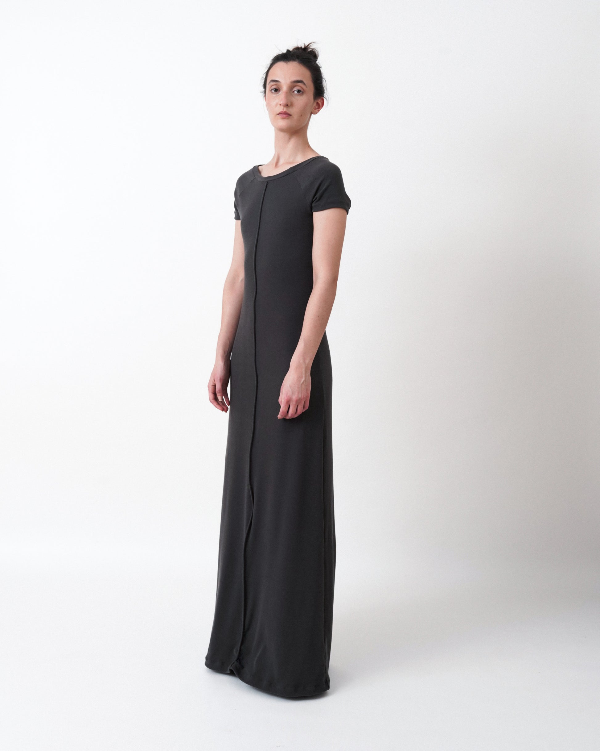 Vestido en rib con un corte básico y un embone vertical en toda la parte delantera que remite a una arteria o a una vena.