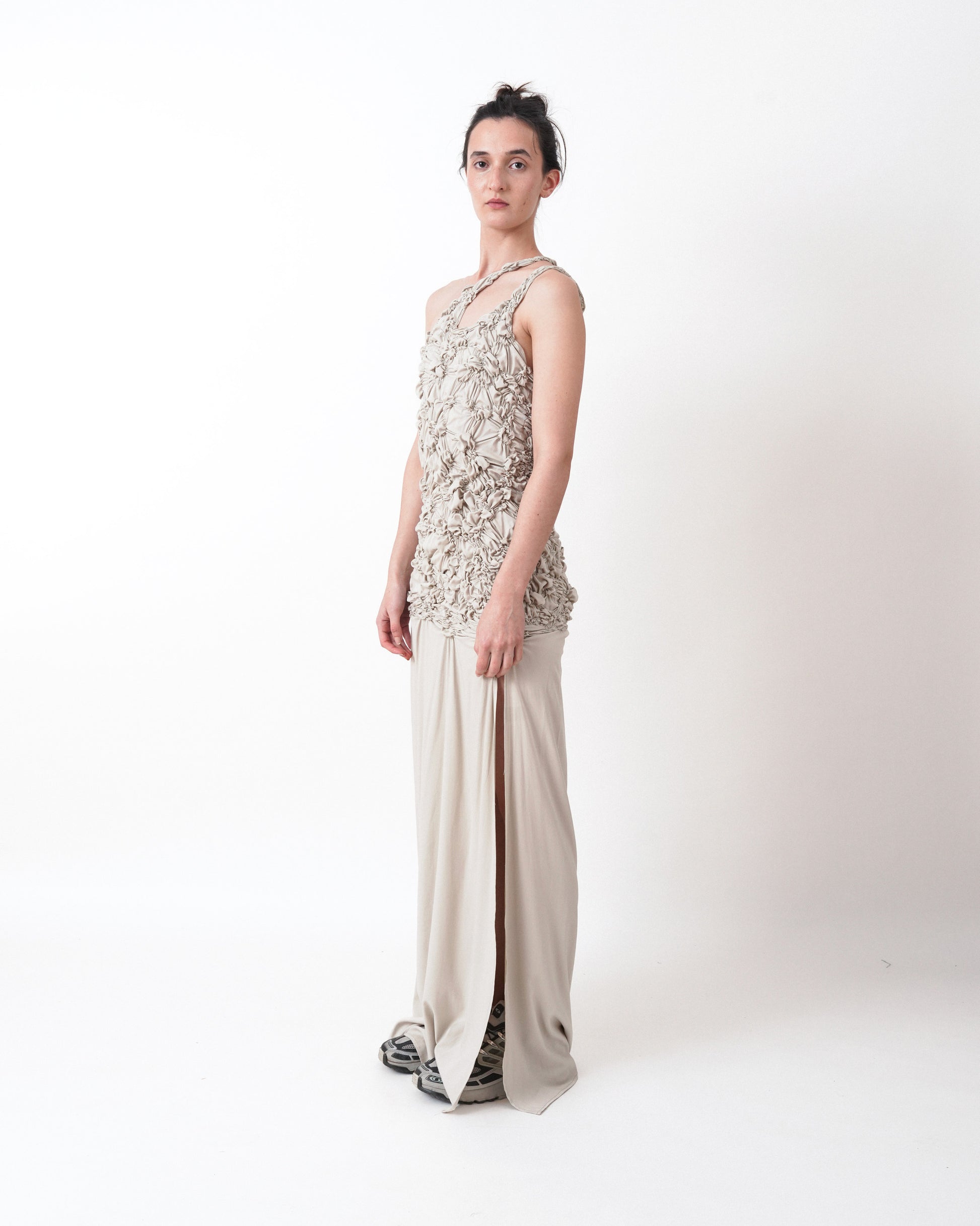 Este es un vestido caótico y asimétrico, pues está hecho con una técnica de fruncido libre, lo que le hace ser una pieza única e irrepetible en su trazo debido a sus procesos artesanales. Abertura lateral y posibilidad de ser confeccionado a sobre medidas, contáctanos a través de nuestros canales de atención.